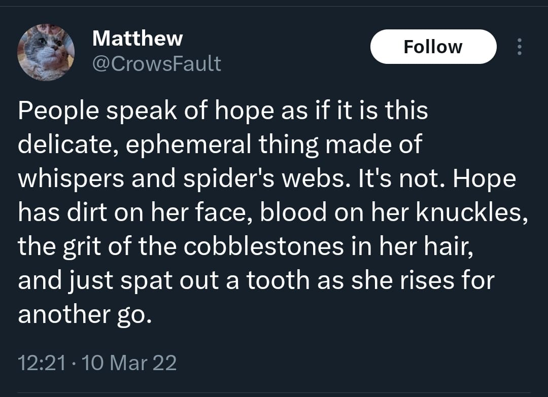 Villains want to tell us that hope is useless, a false light that distracts us from our doom. But by that same token they want us miserable and defeated, because it not only allows them to march in and take over, but it allows them to believe that their misery is justified. Joy is a powerful antidote, laughter always a good response, and believing that nothing is hopeless is the best path we can take in the face of such things.
